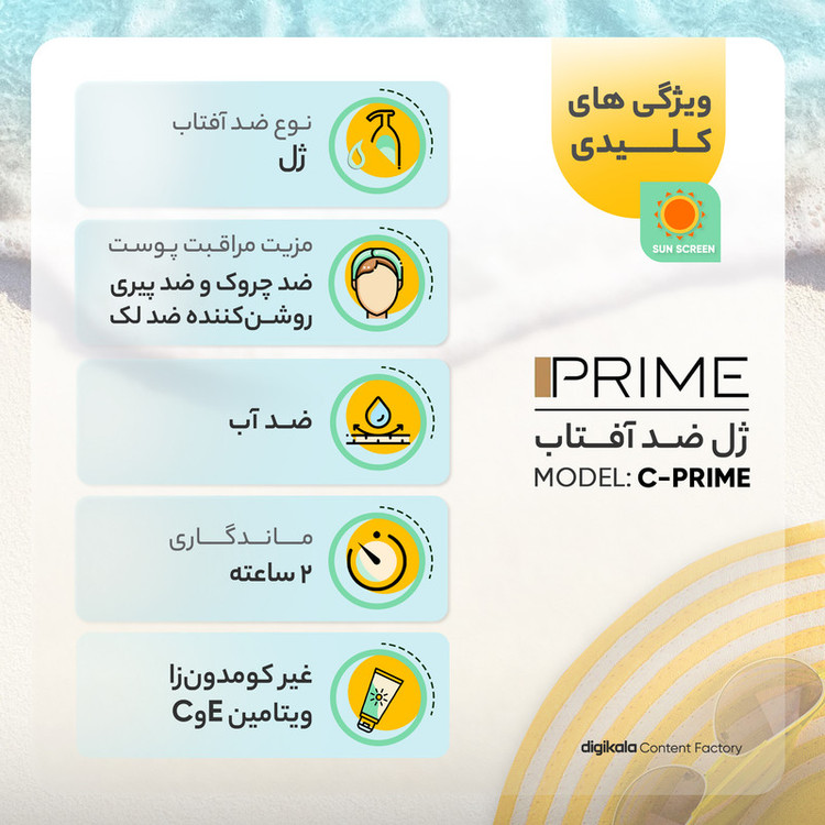 ویژگیهای ضدآفتاب : ضد آب , محافظت کننده در برابر اشعه UVA , محافظت کننده در برابر اشعه UVB , غیر کومدون زا