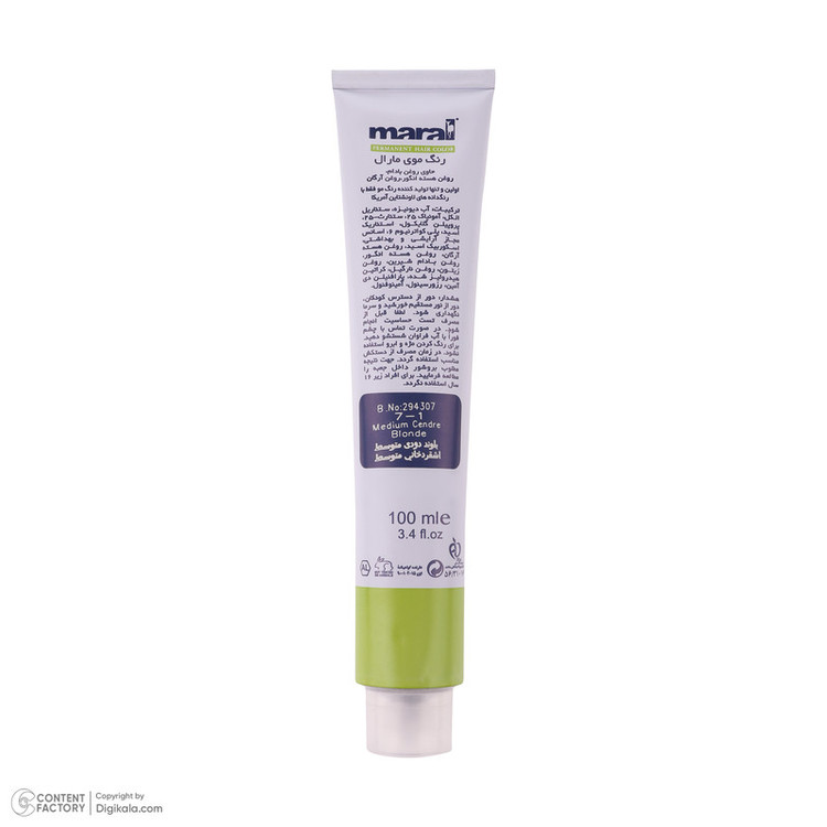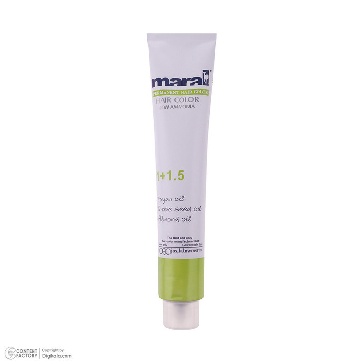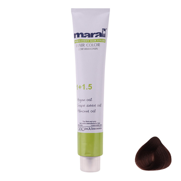 رنگ مو مارال رنگ مو دائمی است که قادر است رنگ موجود موها رو تغییر داده، تیره تر یا روشن تر کند. قدرت پوشش رنگ مو مارال برای موهای خاکستری عالی بوده و در هر شرایطی کاملا پایدار است. رنگ مو مارال حاوی روغن آرگان، روغن هسته ی انگور، روغن بادام، ویتامین، نرم کننده و حالت دهنده ی مو می باشد که باعث درخشندگی مو شده و از خشک شدن و شکنندگی مو جلوگیری می کند. حجم: ۱۰۰ میل نسبت درصد ترکیب ۱ به ۱/۵ برای رنگ مو های معمولی اکسیدان ۶ درصد و رنگ موهای روشن کننده ۱ به ۲ اکسیدان ۹ درصد مارال می باشد.