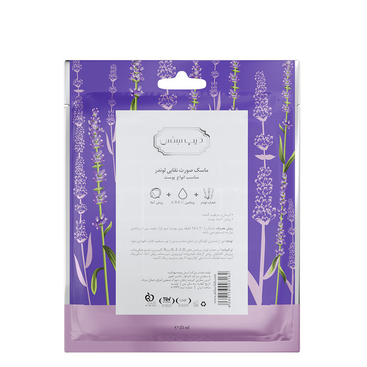 ماسک صورت نقابی لوندر دیپ سنس یک ماسک روشنکننده و آبرسان قوی بوده که با داشتن ترکیبات موثری مانند روغن آملا، ویتامین A و B و E و C و عصاره لوندر به حفظ سلامت پوست کمک میکند.